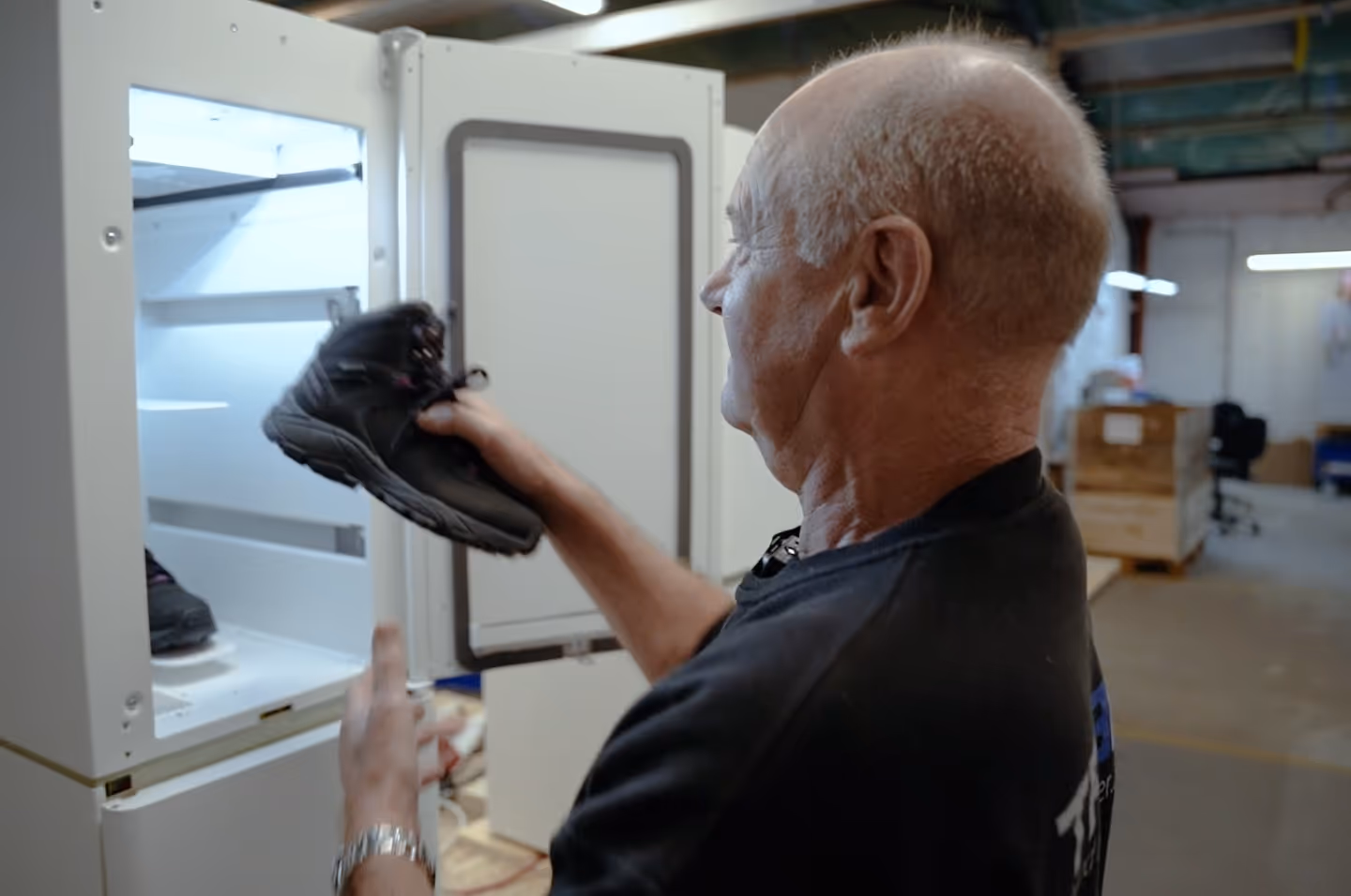 Den banebrydende skobehandling udføres i et specialdesignet vakuumkammer. Med et enkelt tryk på knappen aktiveres en kort, men kompleks proces, hvor seks dysere fordeler skobehandling jævnt over hele skoens overflade.